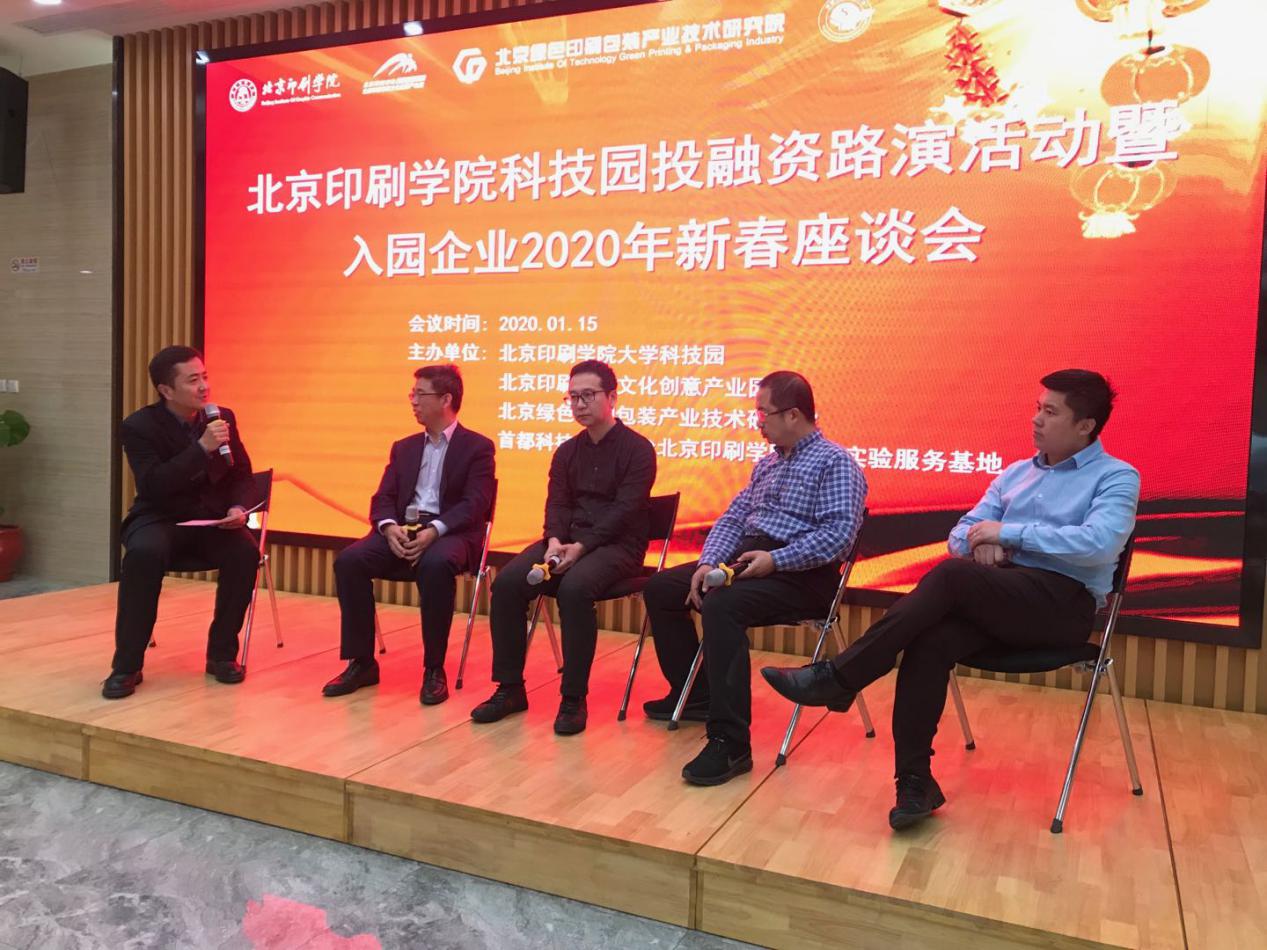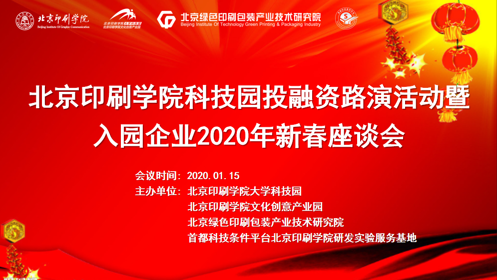 在新春佳节到来之际,为帮助入园企业梳理商业模式,对接投融资资源,搭建企业、园区、资本之间的桥梁,北京印刷学院大学科技园于1月15日下午在新创大厦十五楼第七会议室举办了2020年首场投融资路演活动暨入园企业新春座谈会,为园区企业奉上一份实惠的“新春贺礼”。