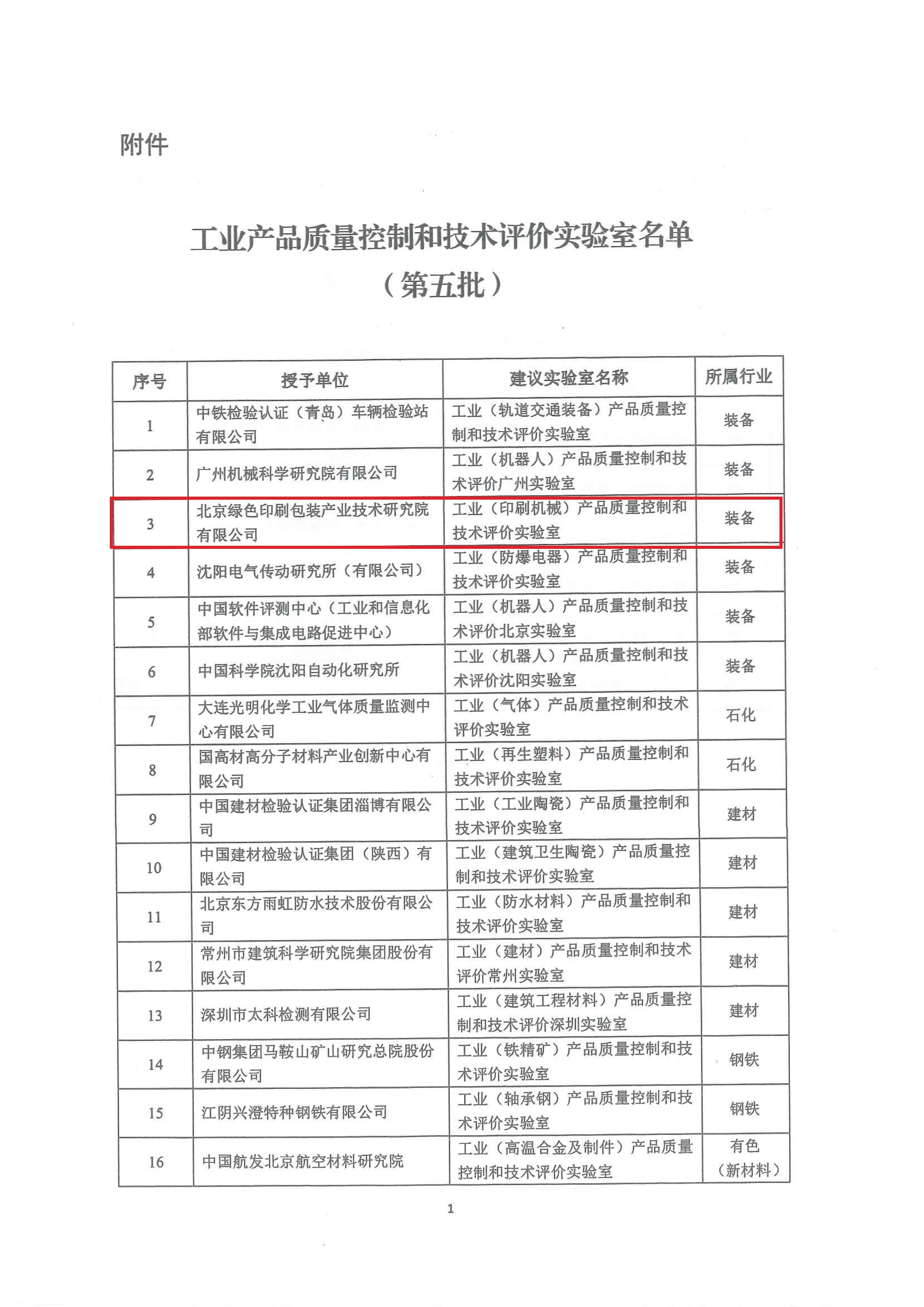 2021年12月3日,工业和信息化部公布了《关于工业和信息化部公布第五批工业产品质量控制和技术评价实验室的通告》(工信部科函〔2021〕340号),北京绿色印刷包装产业技术研究院有限公司依托国家印刷机械质量检验检测中心和北京印刷学院检验检测中心检测平台申报的“工业(印刷机械)产品质量控制和技术评价实验室”,经初审、复审、终审及公示后获得批准。